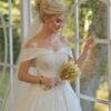Celestine’s off-white wedding dress represents the embodiment of beauty and tenderness in its stunning design. The dress sparkles with its exquisite embroidery that covers the entire fabric, giving it a touch of luxury and brilliance.